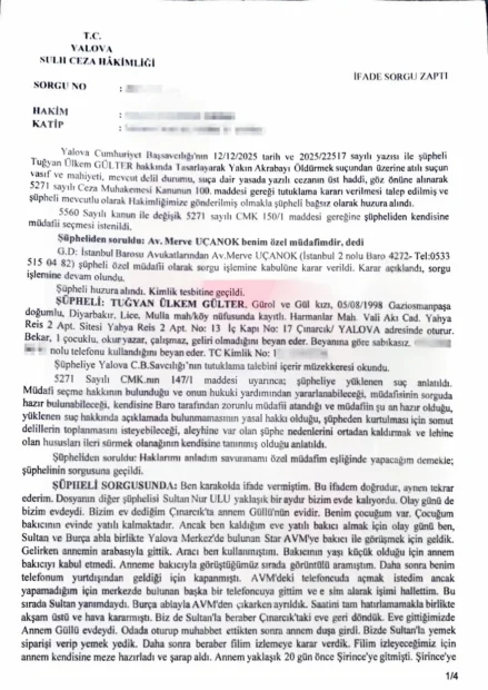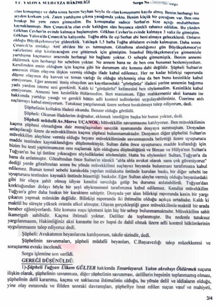 “Biz oynadıktan sonra Gül Anne yüzünü cama dönük haldeydi. O esnada dizlerinin az yukarı kısmından Tuğyan sarılarak Gül Anne’yi itti ve böylelikle dengesini kaybedip düştü. Ben şok oldum. Sonrasında Tuğyan bana ‘koş’ dedi. Aşağı koştuk.”